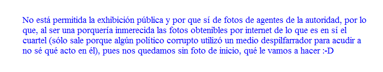 Por cierto, como sindicalista impenitente, tienes mi apoyo para reclamar que te retribuyan conforme a las funciones que realmente realizas, de sargento o más, si es que no lo están haciendo ya; ¡ah!, y sin perdonar un duro, incluida la antigüedad que ya merecerías ostentar en superior categoría, que se las saben todas para ahorrar y recortar, como muy bien sabéis vosotros y vosotra (vosotra, es que sólo vi que hubiera una fémina en el puesto :-D)